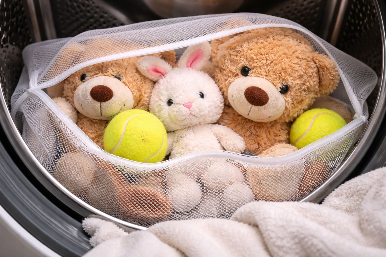 Salajane nüanss: enne pehmete loomade pesumasinasse panemist asetage need paksu võrkkotti ja lisage trumlisse paar tennisepalli – see hoiab ära polsterdava polüestri kokkukukkumise ja hoiab oma kuju.