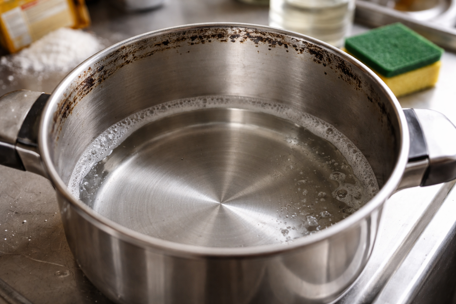 • Valage kahjustatud anuma põhja kuuma vett, nii et see kataks probleemse ala täielikult. • Lisage seesse helded kogused pesuaine roogade jaoks ja segage. • Aseta anum pliidile ja aja vedelik kergelt keema. • Tõsta tulelt, lisa ohtralt söögisoodat ja vala sisse pool klaasi äädikat. • Oodake, kuni äge susisemine lakkab, ja vala määrdunud vedelik lihtsalt kraanikaussi.
