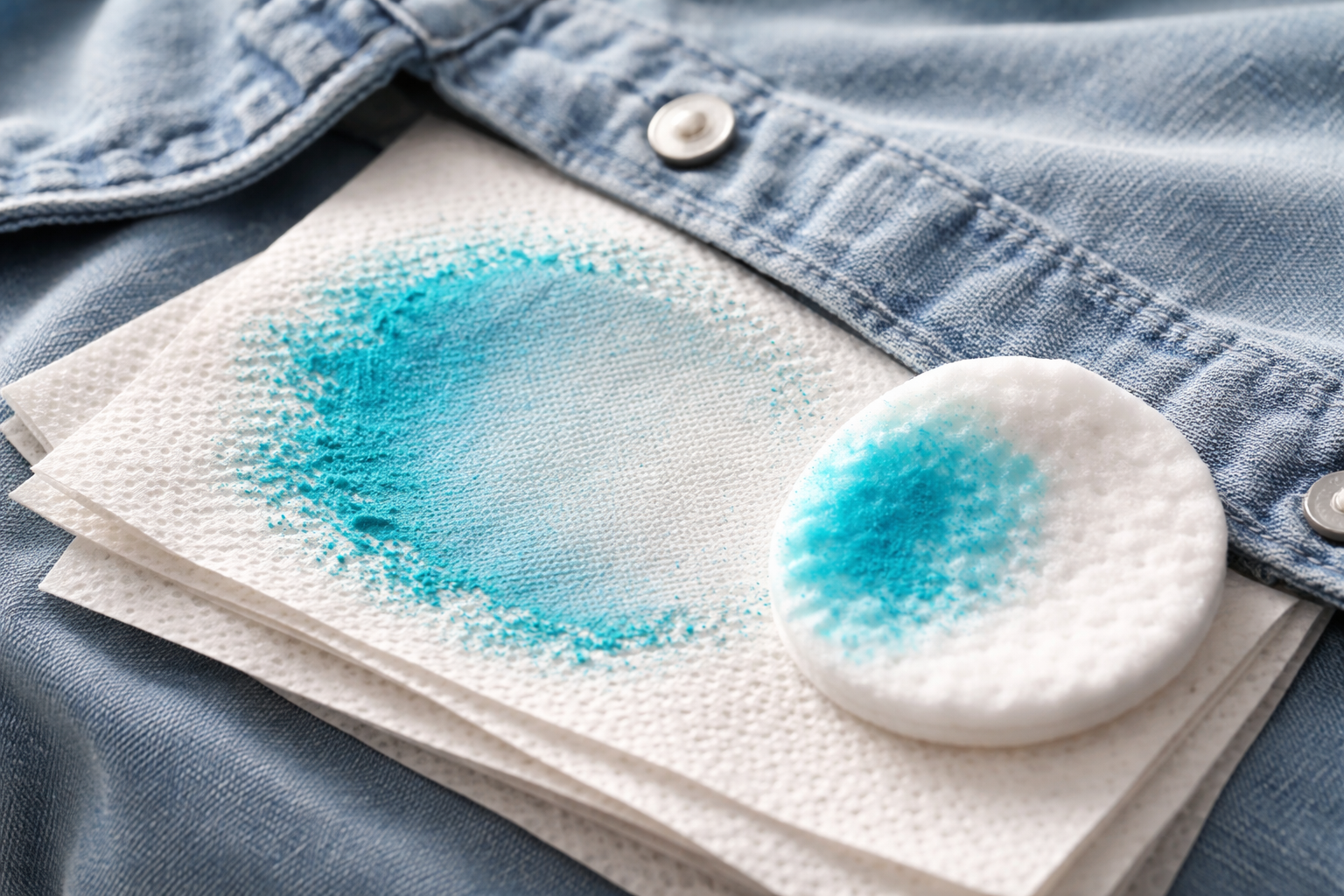 Agressiivne mehaaniline hõõrdumine ajab värvilised osakesed ainult kanga struktuuri sügavamale, seega on parem kasutada õrnaid bloteerivaid liigutusi.