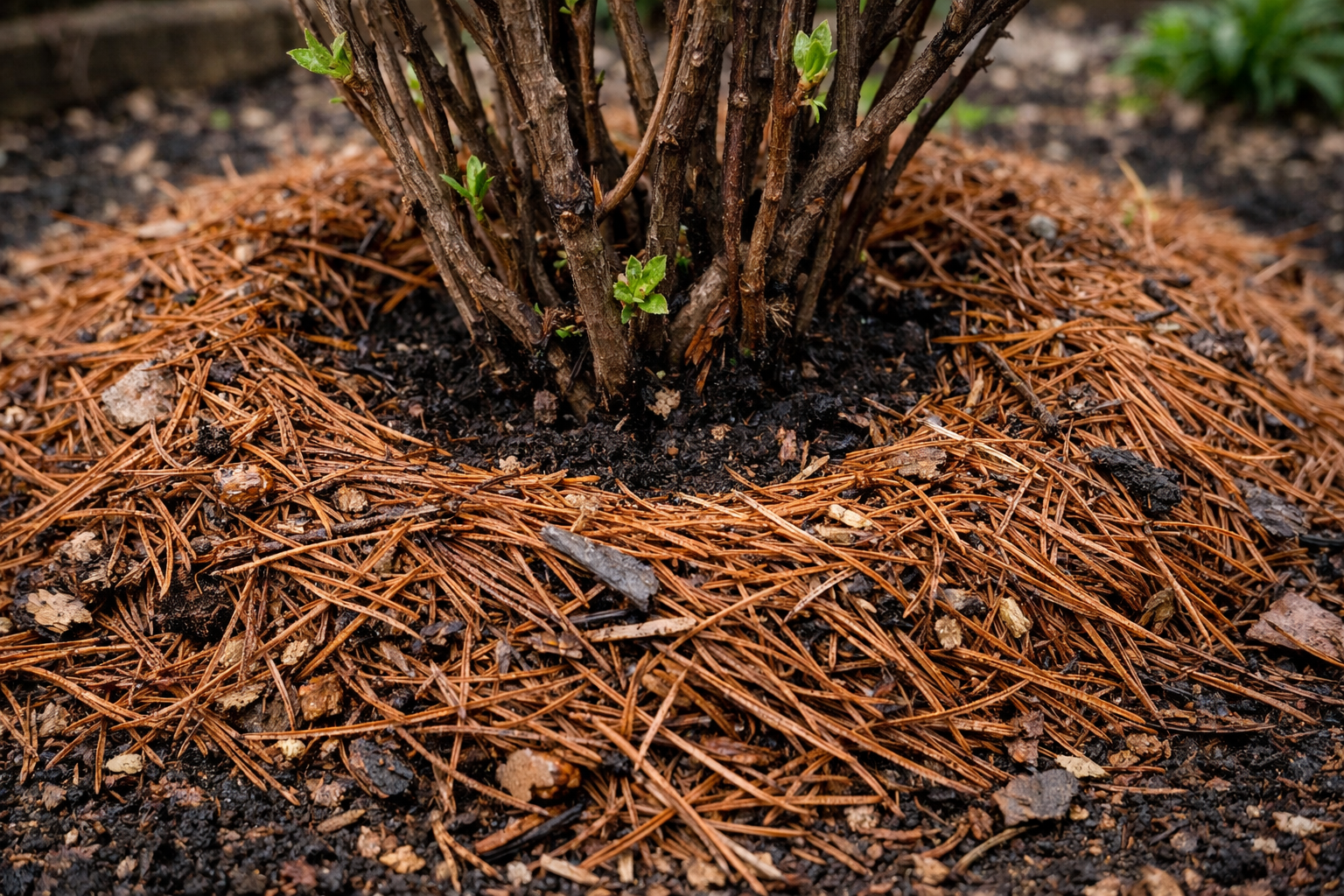 • Esmalt kastke põõsaid ohtralt puhta veega • Jaotage laiali huumuse- või kompostikiht • Asetage nõelad ühtlaselt, jättes tüvest endast paar sentimeetrit • Tampige patja kergelt kätega, et see tuulega minema ei lendaks