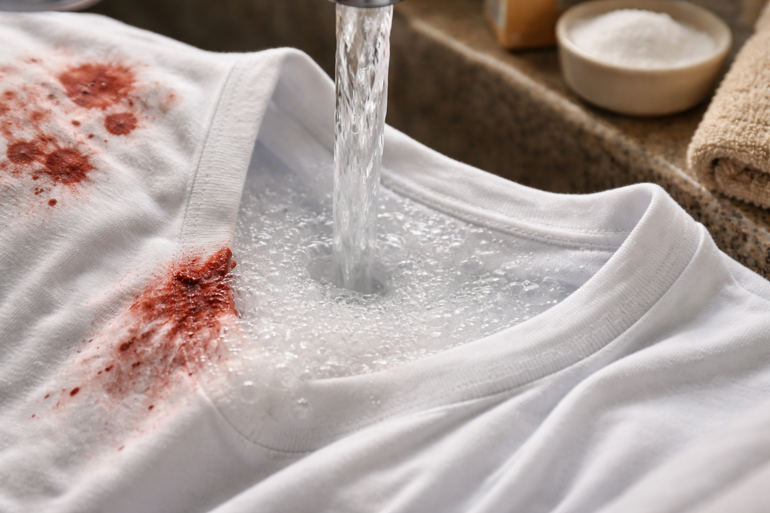 Vere eemaldamise peamine reegel on kasutada eranditult külma vett, kuna kõrge temperatuur keevitab valgu tihedalt otse kiudude sees, muutes selle kustumatuks värvaineks.