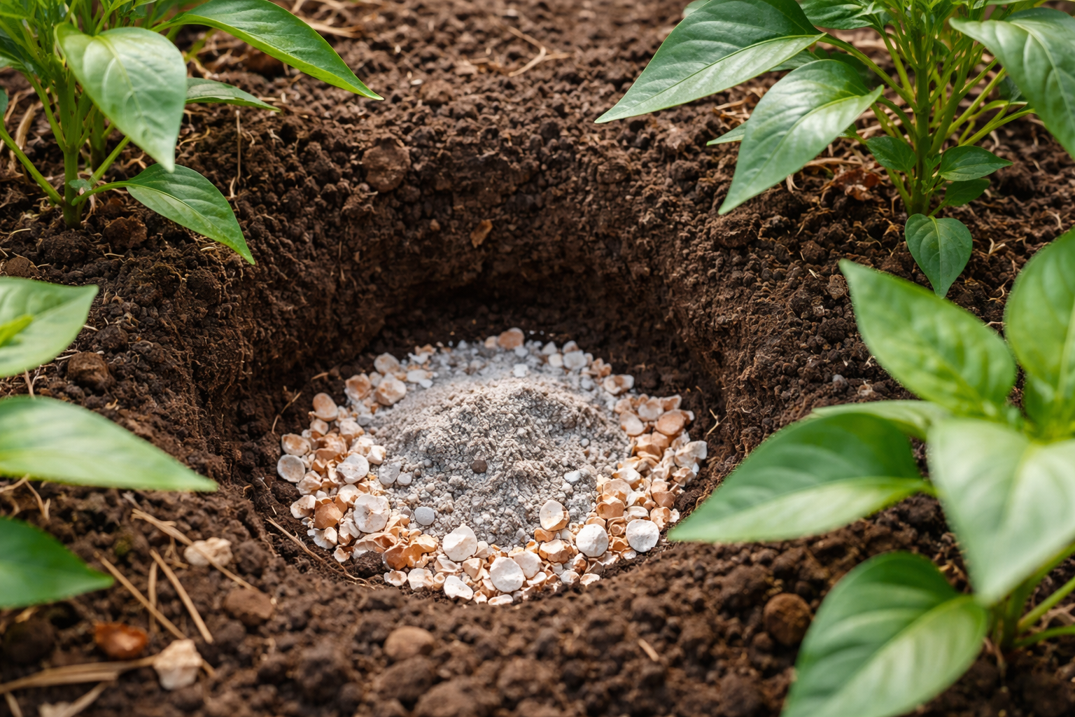 Minu peamine saladus on kasutada peotäie purustatud munakoori ja supilusikatäis puutuhka augu päris põhjas, mis kaitseb õieotsa mädanemise eest ja annab juurestikule tugeva alguse.