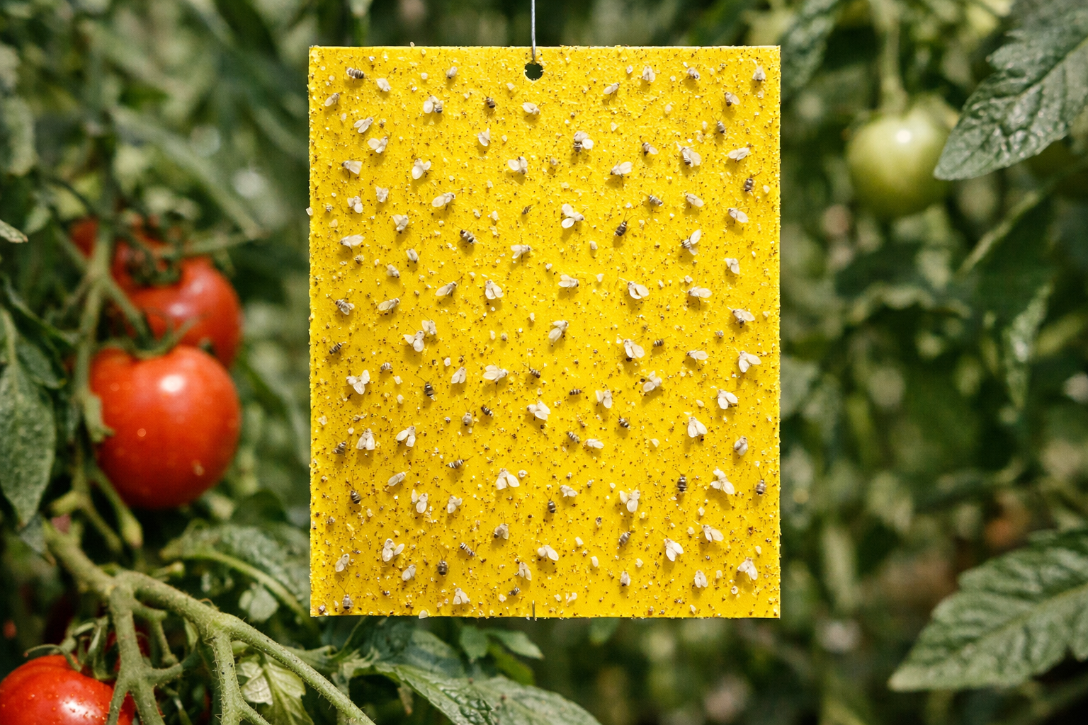 Installige kollased püünised taimede tippude kohal. Valgekärbst tõmbab see konkreetne spekter ja see kleepub koheselt pinnale.